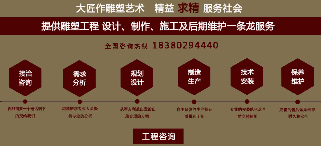 成都大匠作雕塑有限公司,是經(jīng)成都工商局審定注冊(cè)的正規(guī)專業(yè)雕塑制作及工程安裝服務(wù)機(jī)構(gòu),是由一群年輕富有朝氣的年輕人創(chuàng)辦,發(fā)軔于四川省成都市龍泉驛區(qū)。它是一家******于創(chuàng)作、制作和銷(xiāo)售為一體的公司。大匠作擁有多年從事公共藝術(shù)的專業(yè)人員和雕塑制作人組成的核心團(tuán)隊(duì),為您提供專業(yè)、具創(chuàng)新的設(shè)計(jì)及制作服務(wù)。公司成立以來(lái),秉承“******服務(wù)、誠(chéng)信為本”的宗旨,以客戶需求為目標(biāo)導(dǎo)向,不斷學(xué)習(xí),進(jìn)取,優(yōu)化和提高服務(wù)質(zhì)量,公司向您******——“您的滿意***是我們的信譽(yù)”,我們將以飽滿的熱情和******的服務(wù)贏得您的贊譽(yù)和支持。